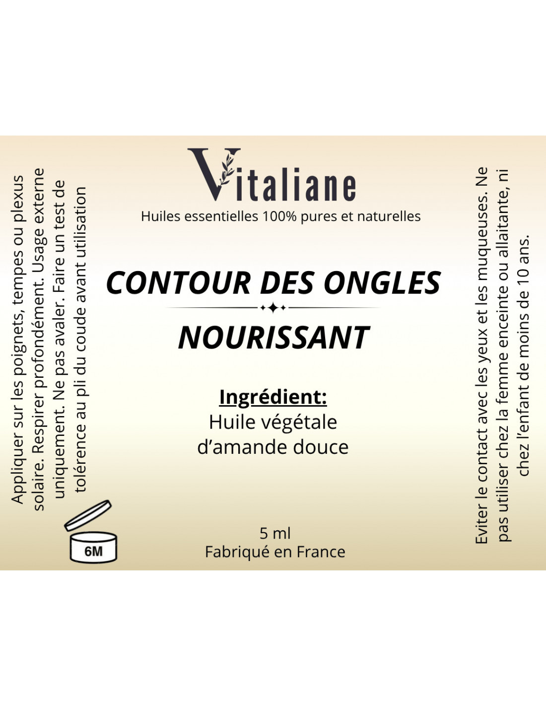 - Huile d’amande douce : hydrate, nourrit et assouplit la peau autour de l’ongle.